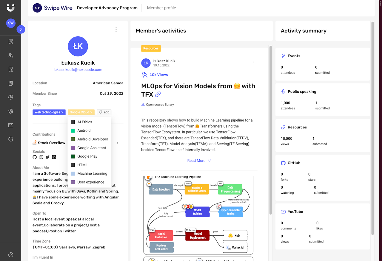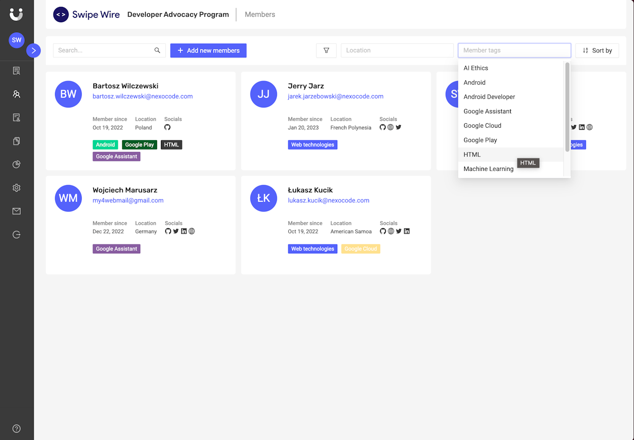 You can use tags to segment them by skills (like public speaking, technical writing), by a product they're experts in (like Android, Azure), technology they work in (like Java, Kotlin, Angular, Go) or anything that'd be useful for you.